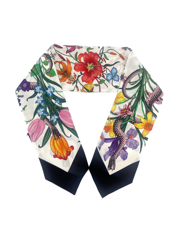 Questo twilly in seta unisce il celebre motivo Flora di Gucci a un audace serpente rosa, per un risultato simbolico e contemporaneo.