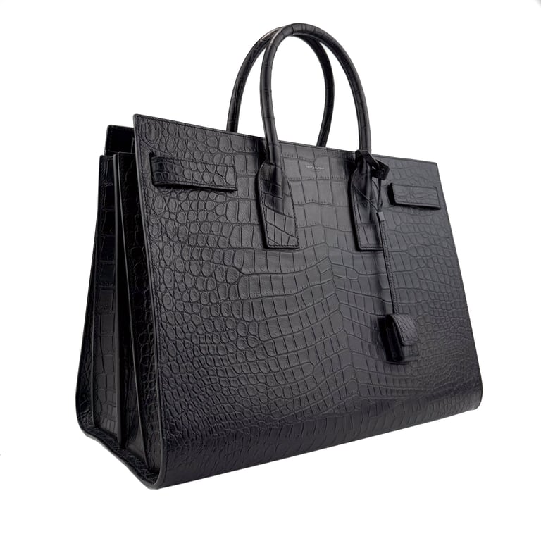 The Sac De Jour Large by Saint Laurent (Yves Saint Laurent – YSL) is crafted in black croc-embossed leather with a structured silhouette, rigid top handles, and clean details.