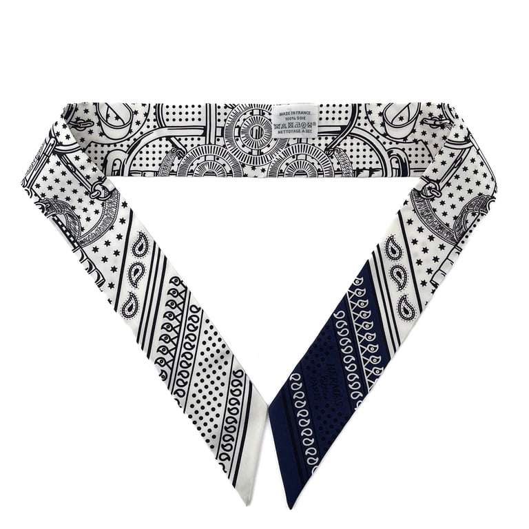 Realizzato in Francia in seta 100% nei toni del blu navy e bianco, unisce ispirazione equestre e stile western in un accessorio grafico e raffinato.